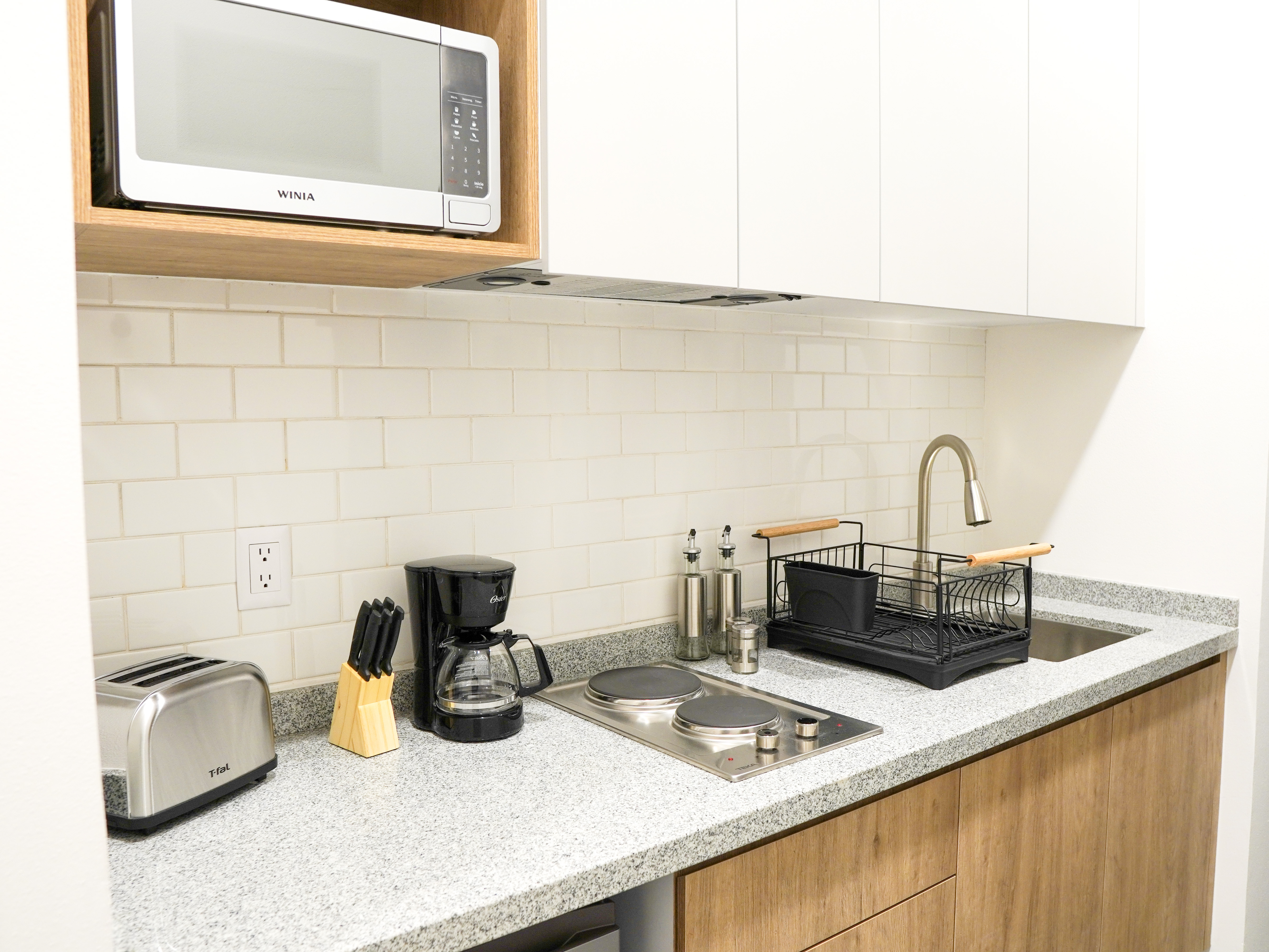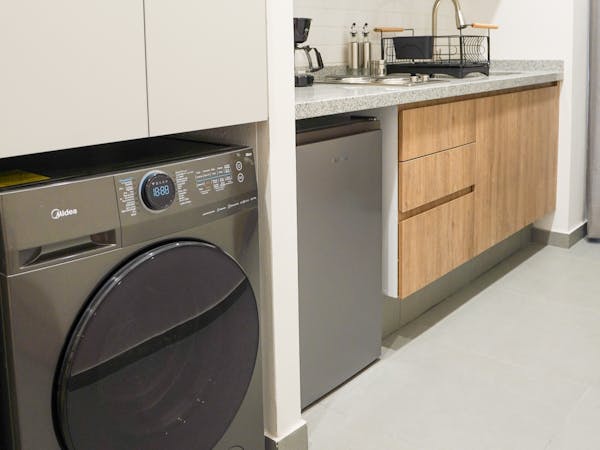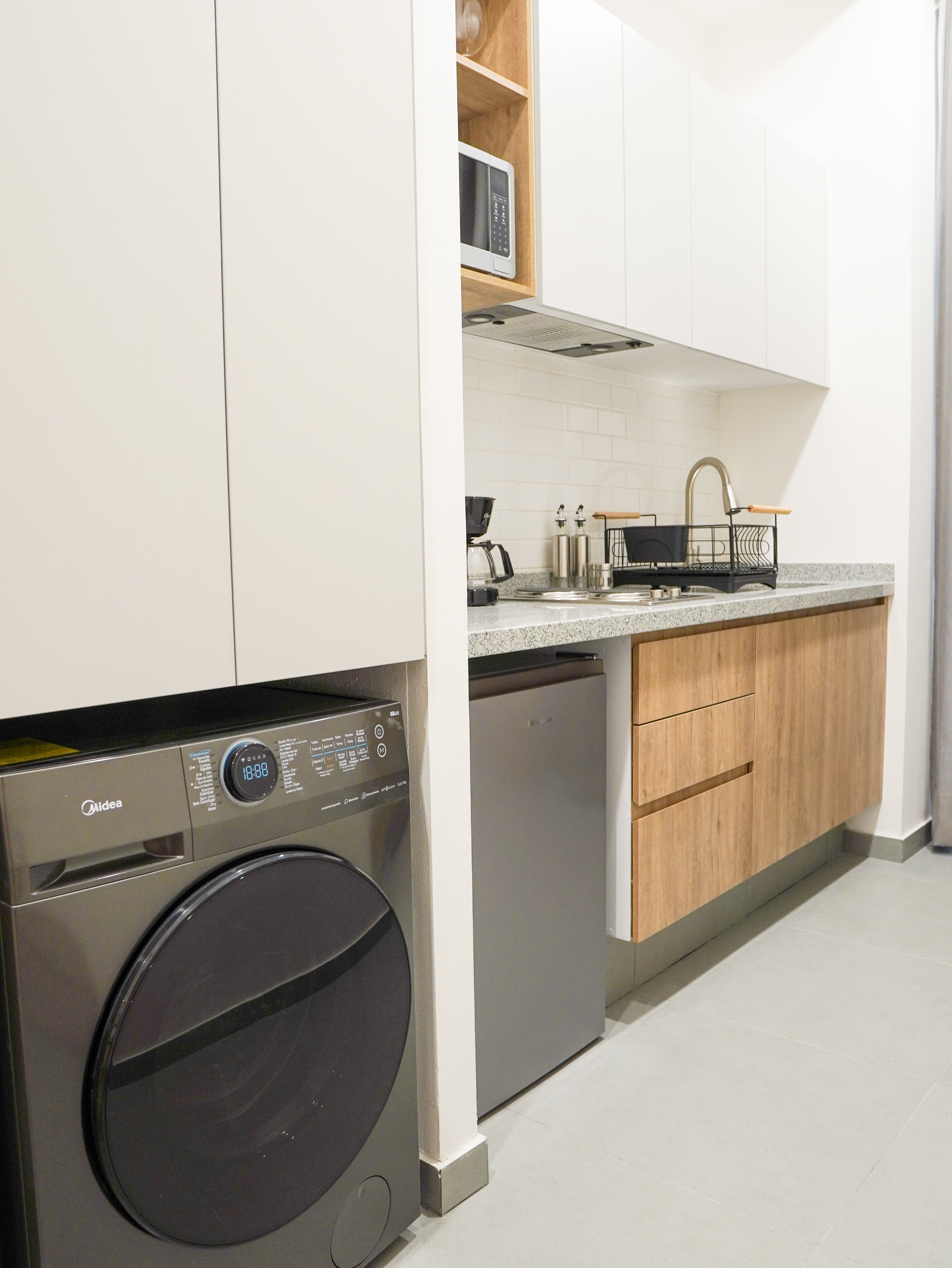 Relax in this comfortable studio that has everything you need to enjoy a morning coffee or tea or simply watch a free movie at night. It features FREE WiFi for remote work. It has a Queen-size bed and a small balcony. The bathroom is fully equipped with amenities and towels. The kitchen has everything you need to cook your favorite dishes. There is a washer-dryer inside the room for your laundry needs.