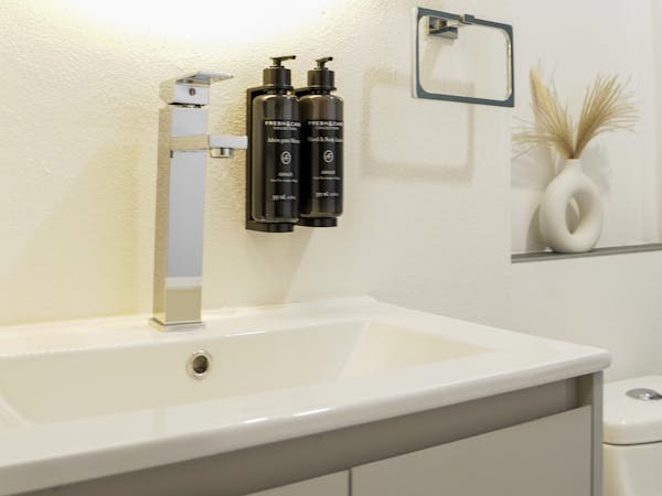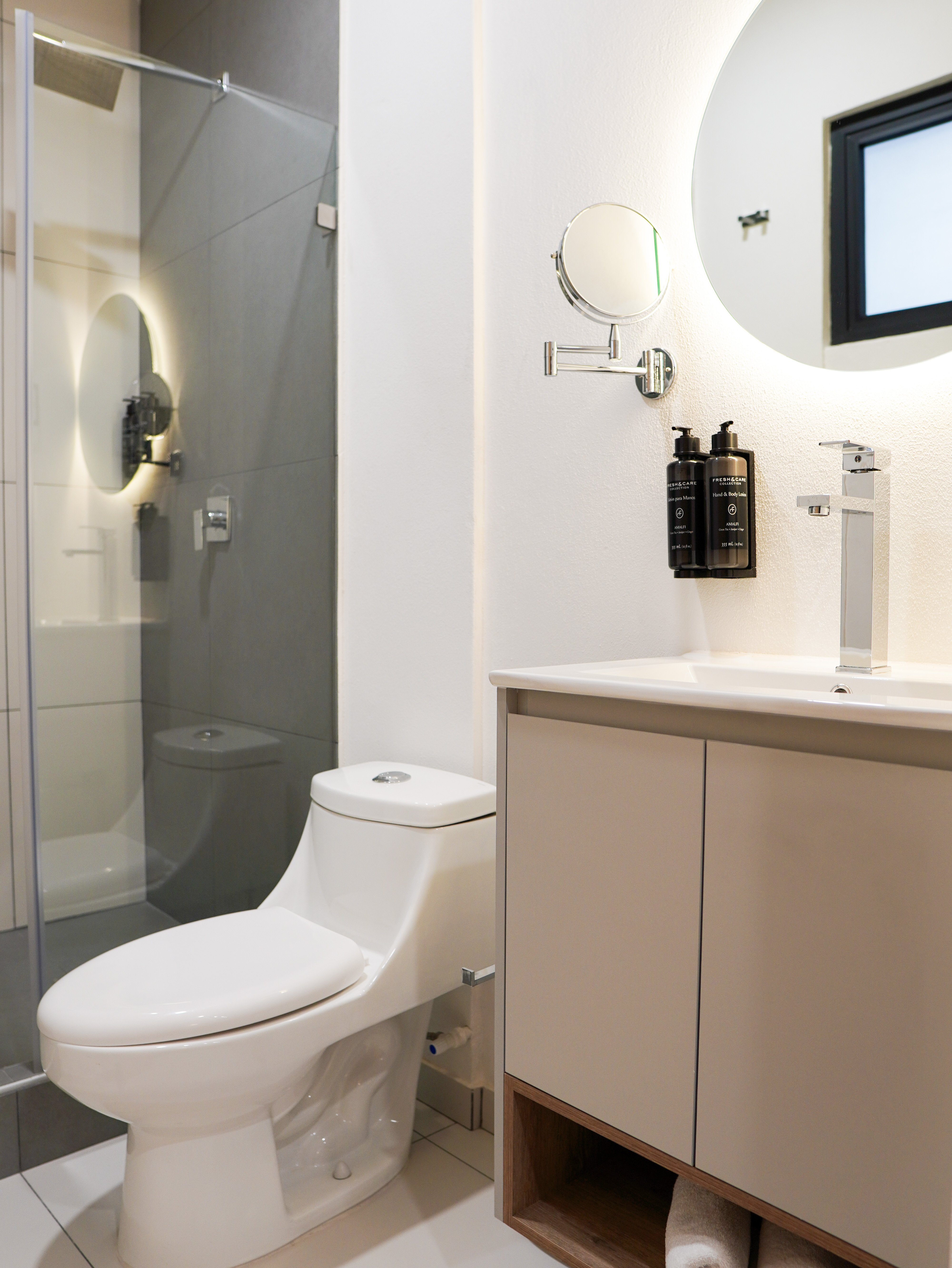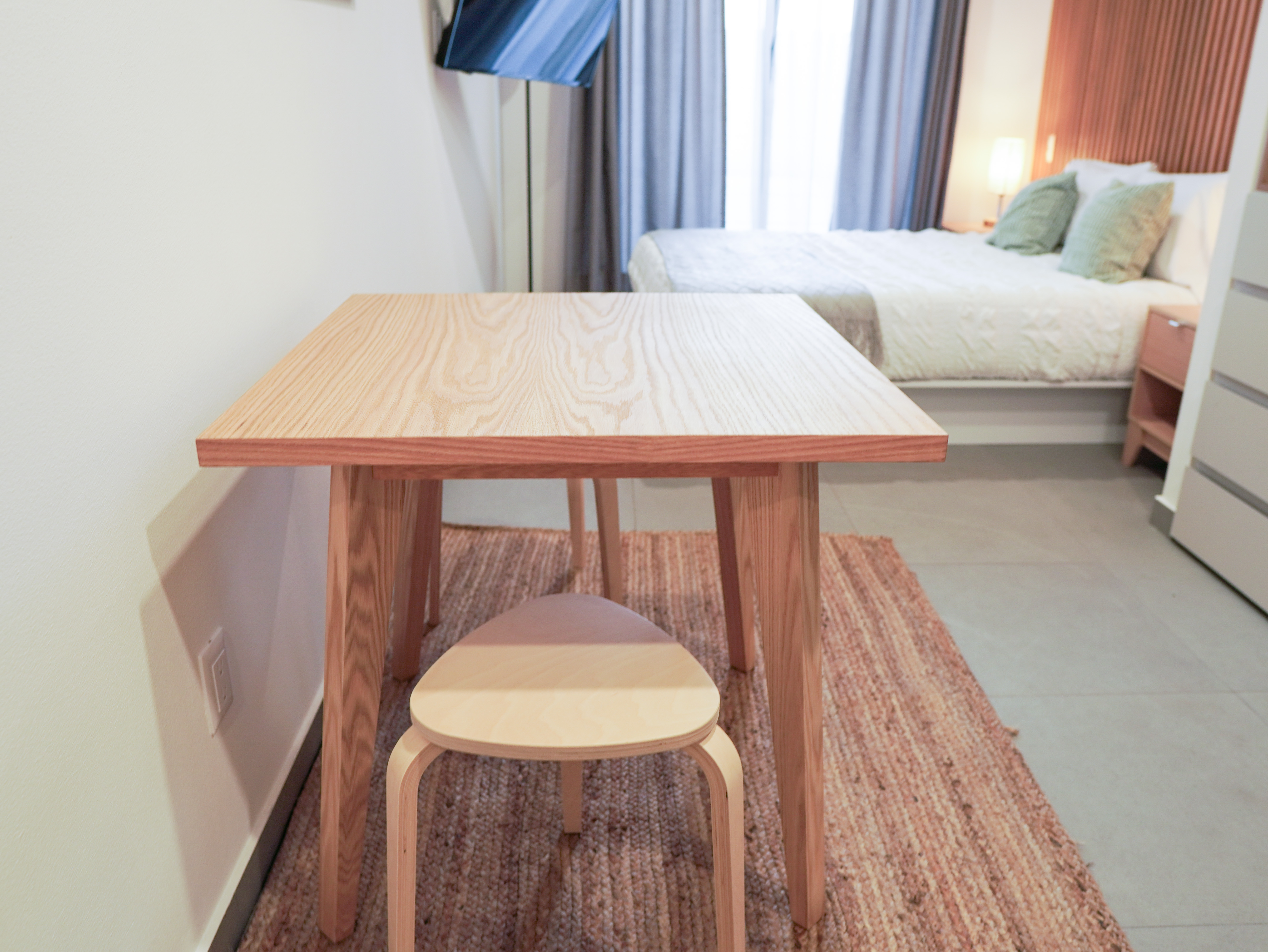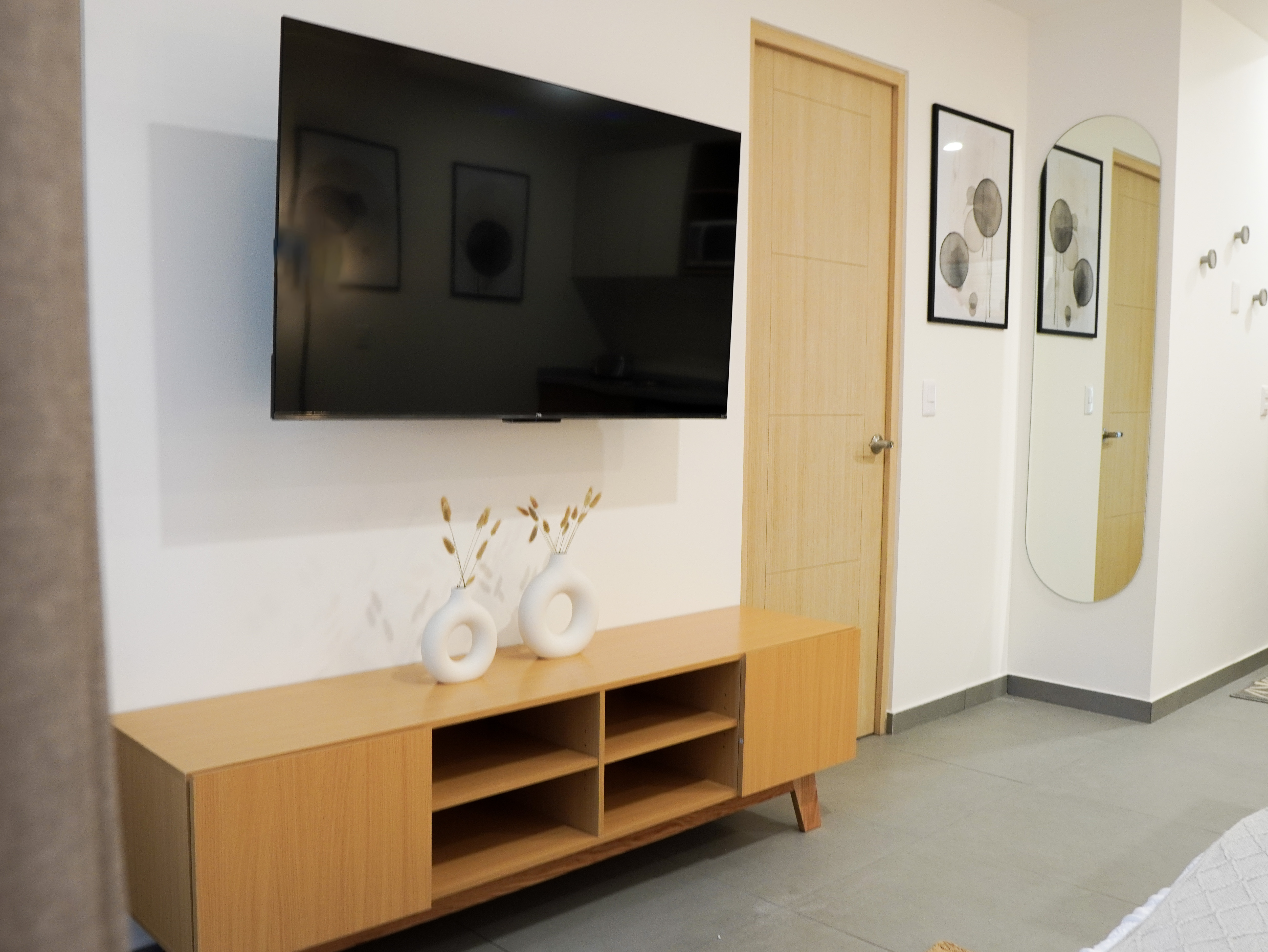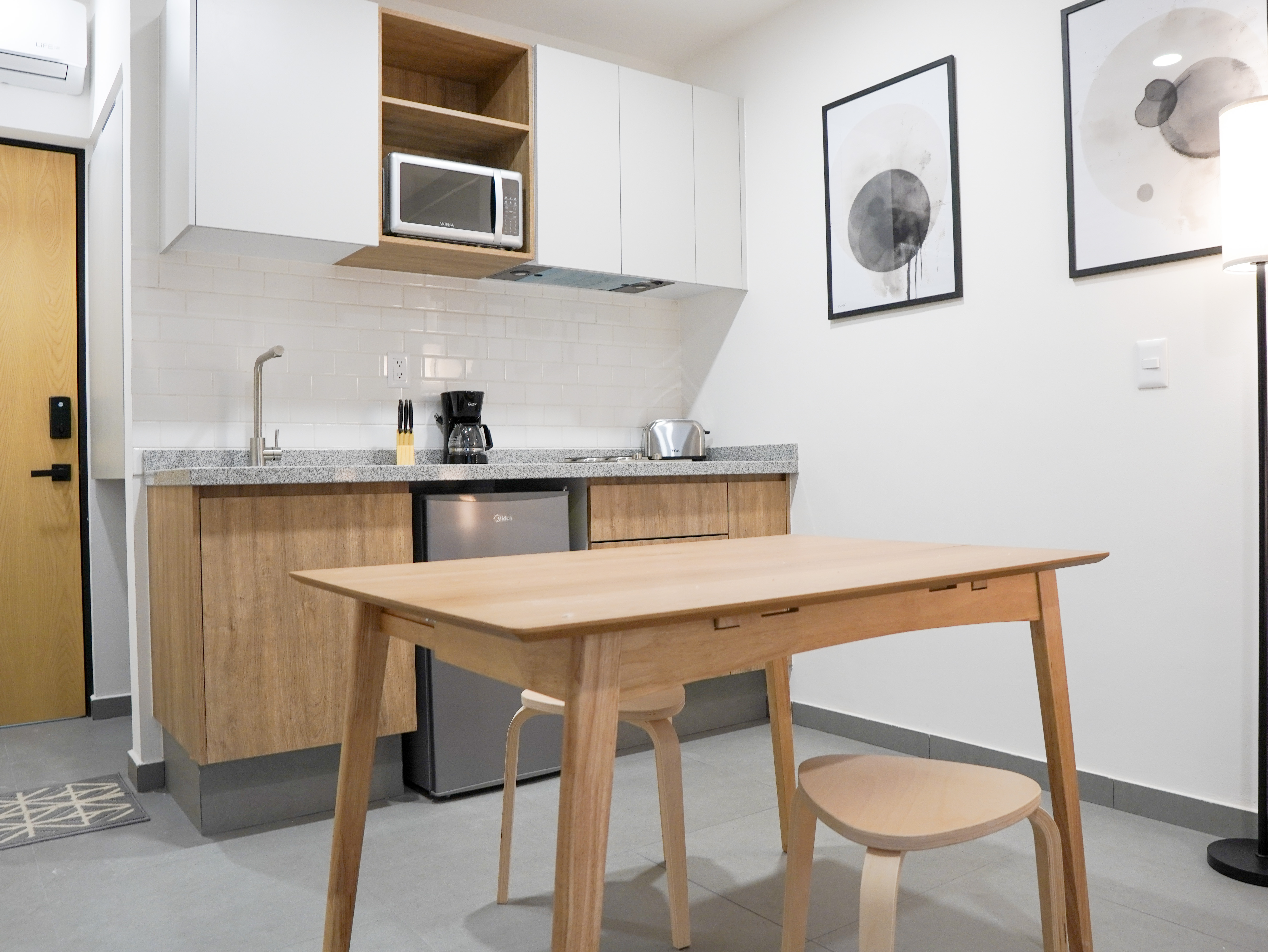 Relax in this comfortable studio that has everything you need to enjoy a morning coffee or tea or simply watch a free movie at night. It features a dedicated home office space with an ergonomic chair for your comfort and free WiFi. It has a Queen-size bed and a small balcony. The bathroom is fully equipped with amenities and towels. The kitchen has everything you need to cook your favorite dishes. There is a washer-dryer inside the room for your laundry needs.