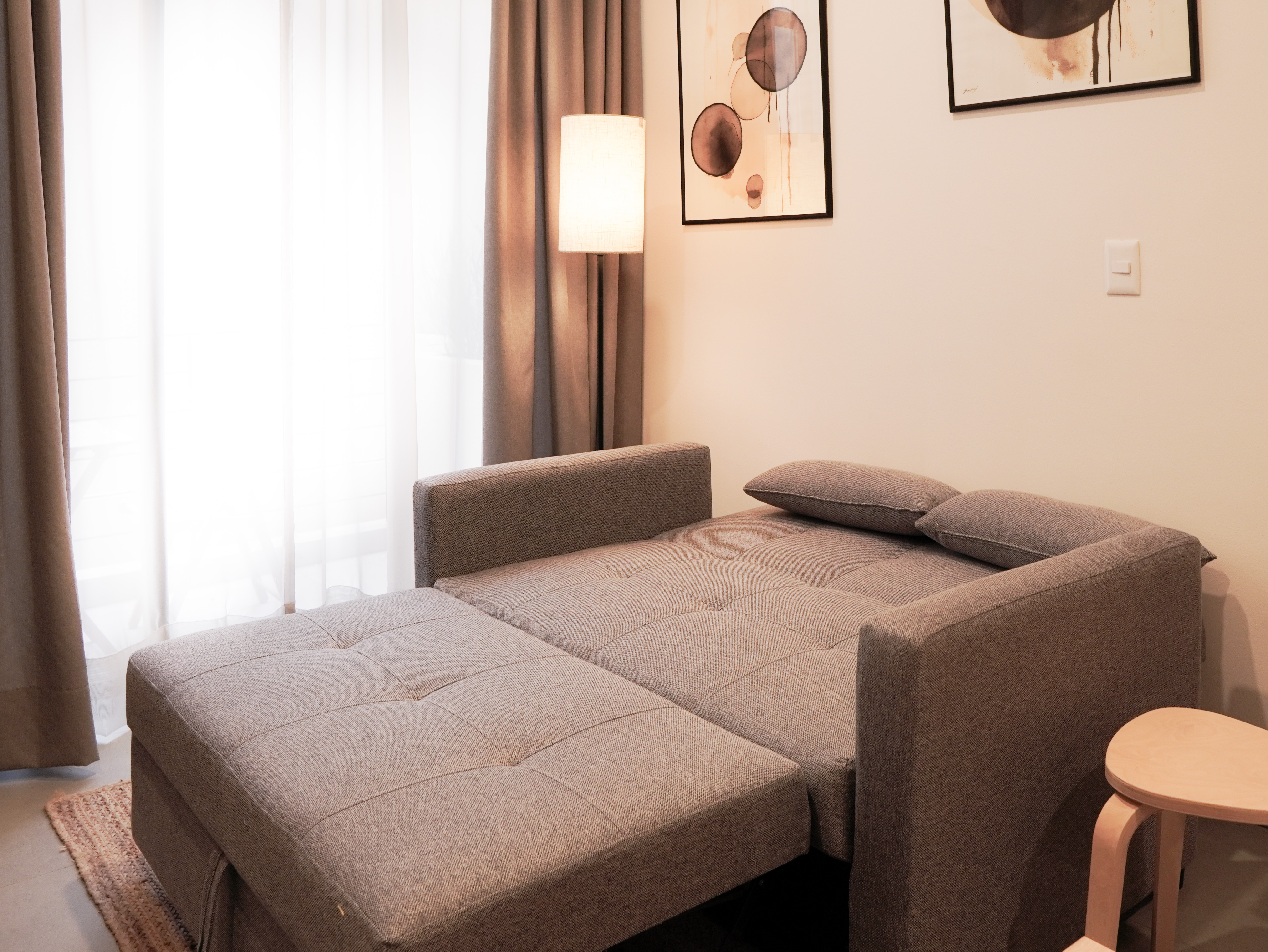 The cozy studio provides a comfortable environment for relaxation and functionality. It includes amenities such as a small desk and free Wi-Fi for remote work. The space features a Queen-size bed, a double sofa bed, and a small terrace. The fully equipped bathroom and kitchen offer convenience, and a washer-dryer is provided within the room for laundry needs.