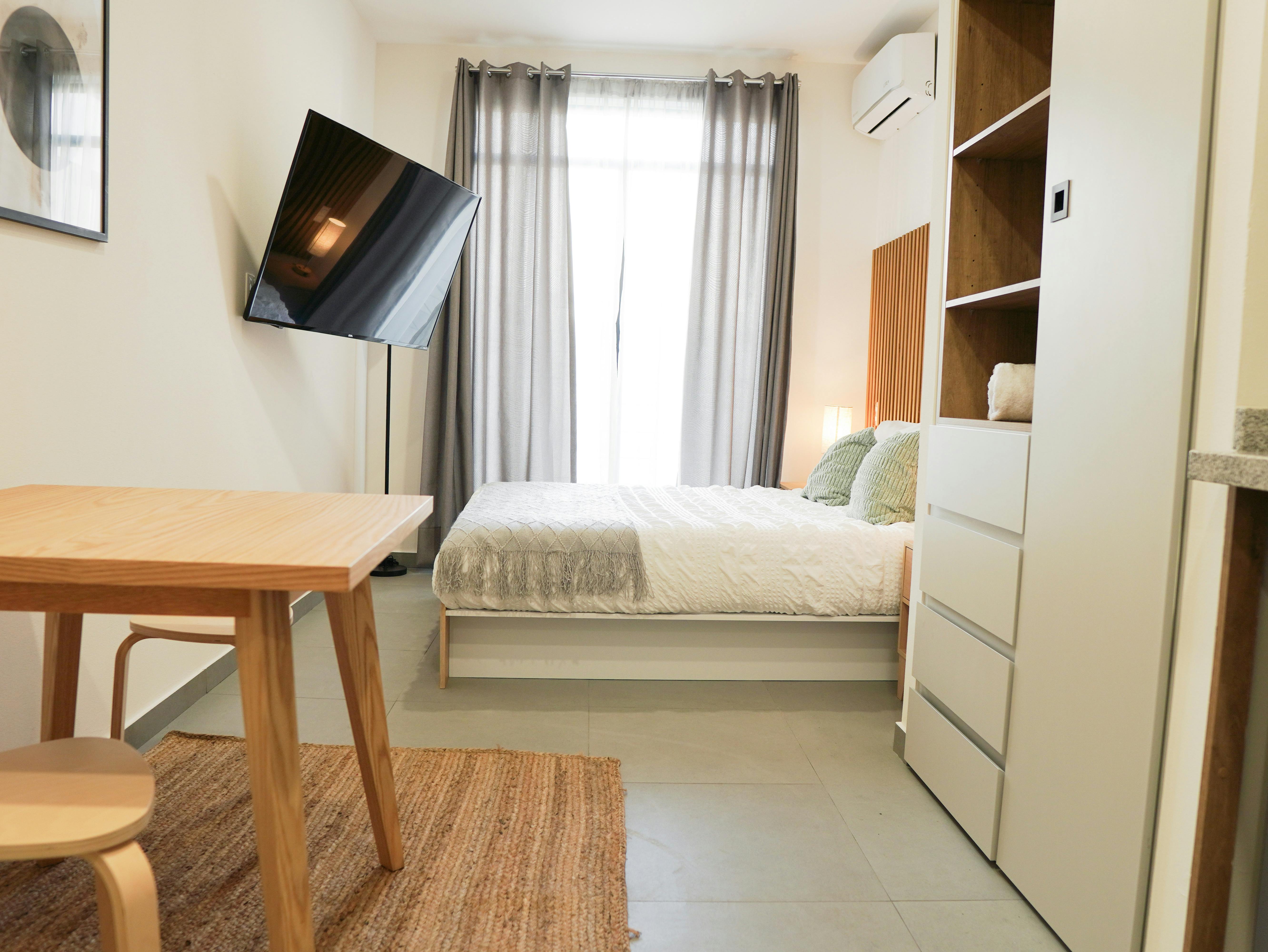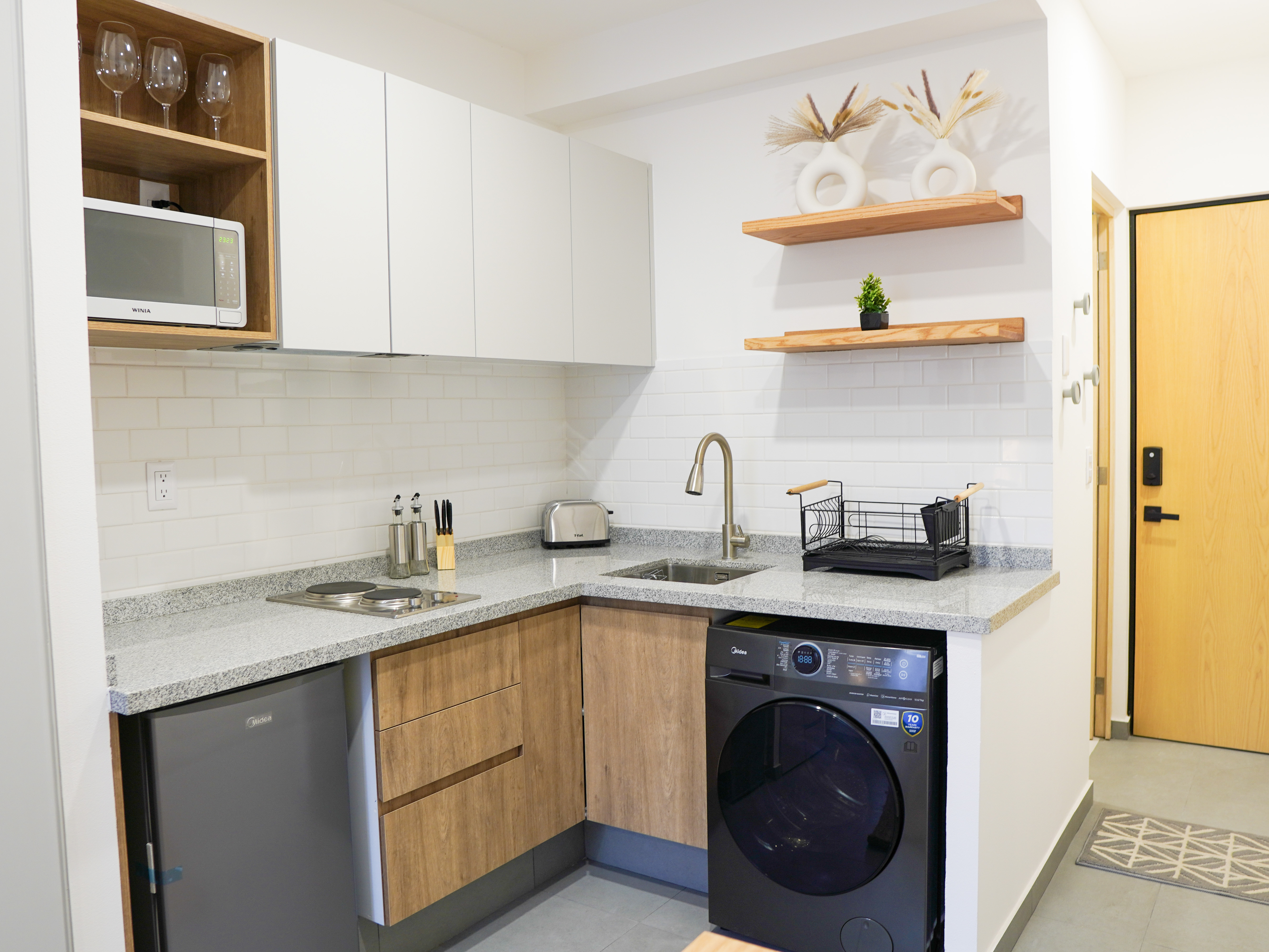 Relax in this comfortable studio that has everything you need to enjoy a morning coffee or tea or simply watch a free movie at night. It features FREE WiFi for remote work. It has a Queen-size bed and a small balcony. The bathroom is fully equipped with amenities and towels. The kitchen has everything you need to cook your favorite dishes. There is a washer-dryer inside the room for your laundry needs.